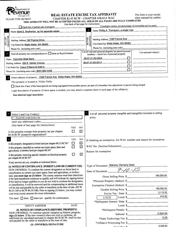 | 3 | 09/11/2015 | SWD | STATUTORY WARRANTY DEED | BROTHERTON MARK E | THOMPSON PHILLIP A | | 2-PARCELS | $165,000.00 | 128801 | 2015-07958 |