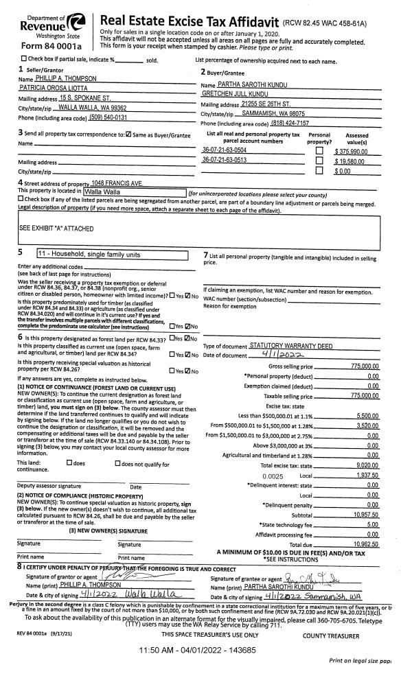 | 1 | 04/01/2022 | SWD | STATUTORY WARRANTY DEED | THOMPSON PHILLIP A | KUNDU PARTHA SAROTHI & GRETCHEN JILL | | 2-PARCELS | $775,000.00 | 143685 | 2022-02732 |