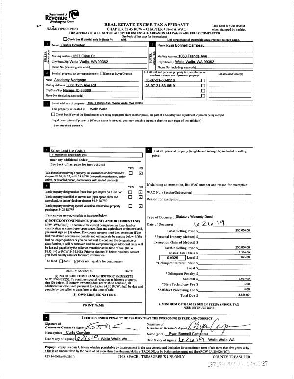 | 1 | 07/01/2019 | SWD | STATUTORY WARRANTY DEED | COWDEN CURTIS R | CAMPEAU RYAN BONNELL | | 2-PARCLES | $250,000.00 | 137199 | 2019-04678 |