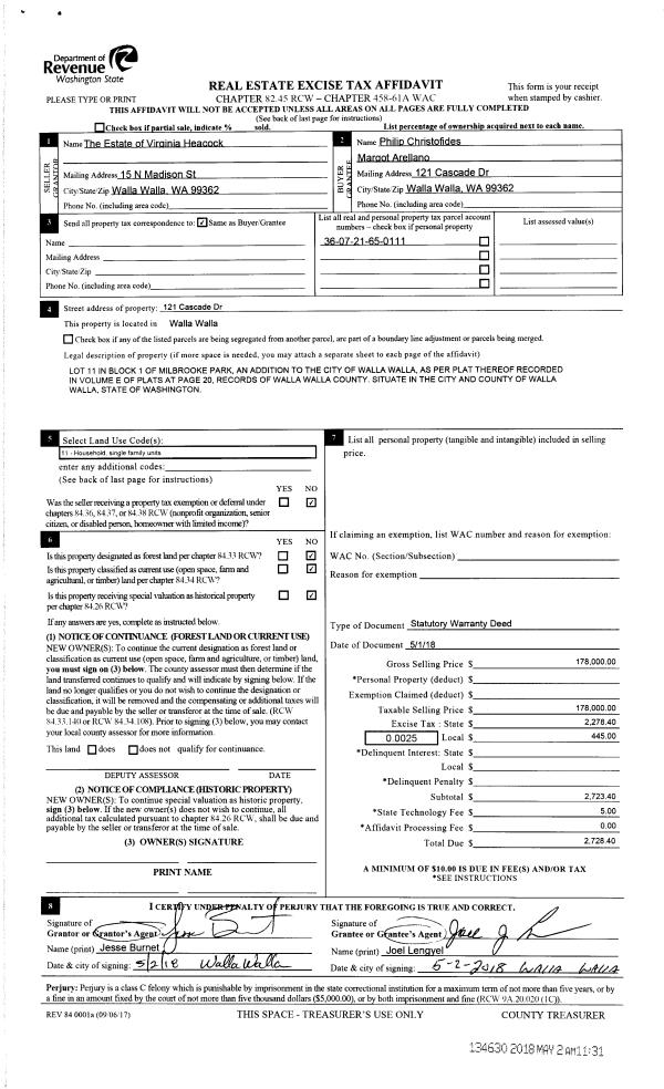 | 3 | 05/02/2018 | SWD | STATUTORY WARRANTY DEED | HEACOCK VIRGINIA M ESTATE OF | CHRISTOFIDES PHILIP A | | | $178,000.00 | 134630 | 2018-03465 |