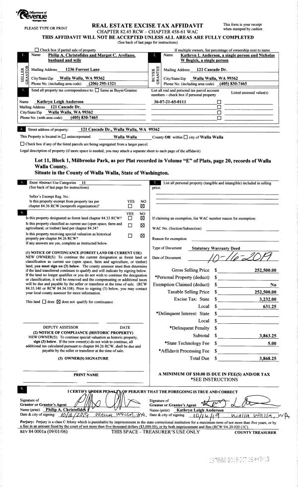 | 2 | 10/16/2019 | SWD | STATUTORY WARRANTY DEED | CHRISTOFIDES PHILIP A | ANDERSON KATHRYN L | | | $252,500.00 | 137882 | 20219-08313 |