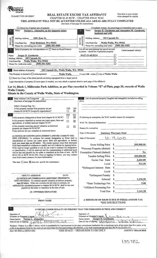 | 1 | 10/24/2018 | SWD | STATUTORY WARRANTY DEED | ALEJANDRE ARTURO R & NORMA L | GORSHENIN SERGEY D & ALEXANDRA M | | | $205,000.00 | 135782 | 2018-08776 |