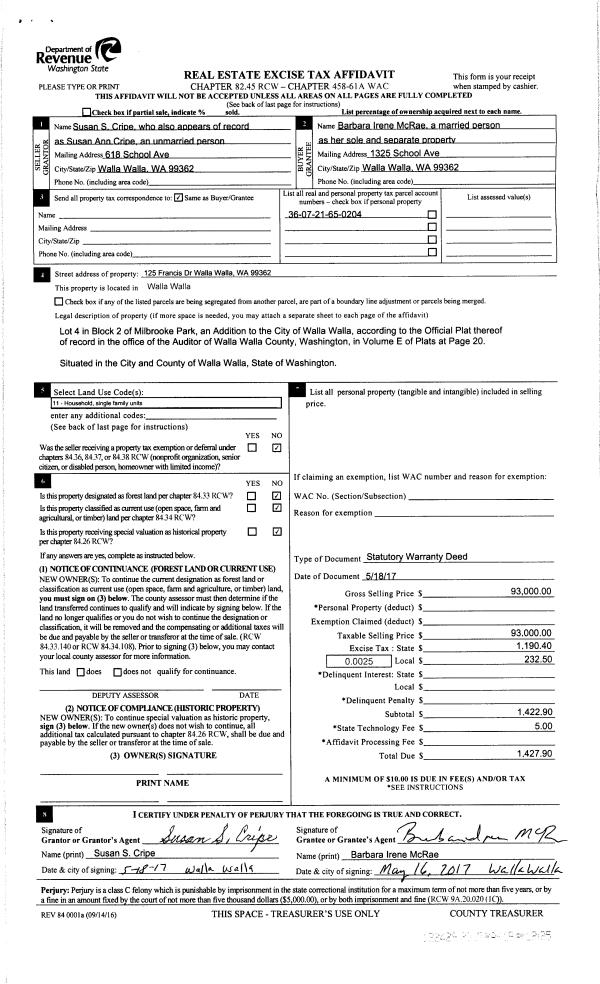 | 1 | 05/19/2017 | SWD | STATUTORY WARRANTY DEED | CRIPE SUSAN | MCRAE BARBARA I | | | $93,000.00 | 132429 | 2017-03791 |