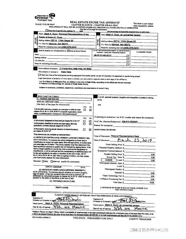 | 1 | 03/23/2019 | DPR | DEED OF PERSONAL REPRESENTATIVE | DUNN KAREN K | DUNN MARK A | | | $0.00 | 136612 | 2019-02101 |