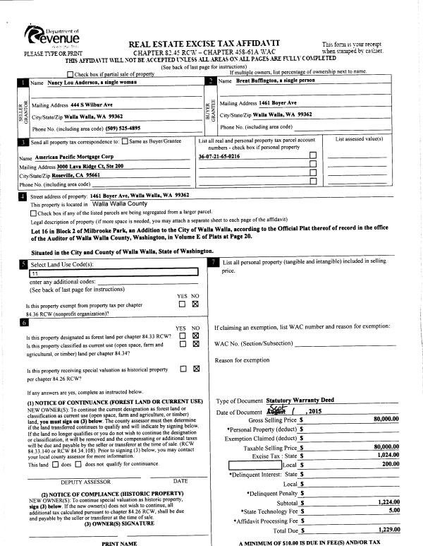 | 1 | 09/02/2015 | SWD | STATUTORY WARRANTY DEED | ANDERSON NANCY LOU | BUFFINGTON BRENT | | | $80,000.00 | 128754 | 2015-07759 |