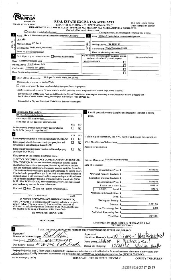 | 2 | 10/27/2016 | SWD | STATUTORY WARRANTY DEED | MATSCHUKAT HANS & ELIZABETH | MATSCHUKAT WILLIAM P | | | $131,500.00 | 131333 | 2016-08920 |
