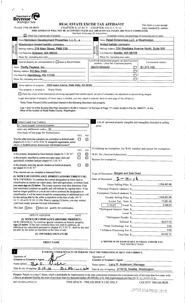 | 2 | 02/23/2016 | BARGAIN & | BARGAIN & SALE DEED | NICHOLSON DEVELOPMENT PROPERTIES LLC ET AL | RETAIL ENTERPRISES LLC ET AT | | | $1,334,492.00 | 129735 | 2016-01378 |