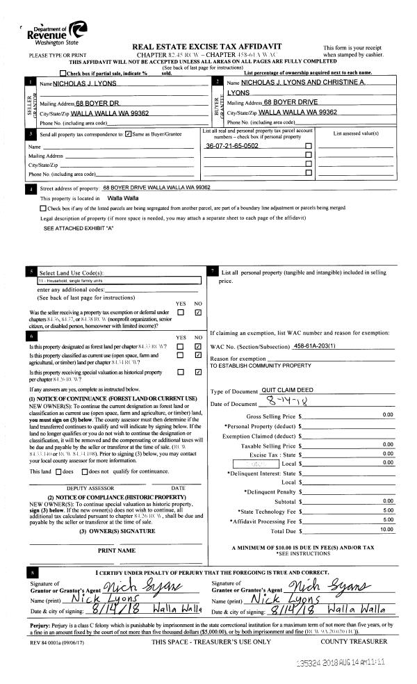 | 2 | 08/14/2018 | QCD | QUIT CLAIM DEED | LYONS NICHOLAS J | LYONS NICHOLAS J & CHRISTINE A | | | $0.00 | 135324 | 2018-06648 |