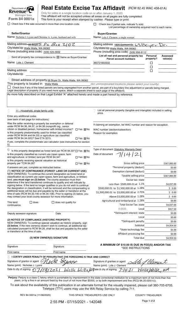 | 1 | 07/15/2021 | SWD | STATUTORY WARRANTY DEED | LYONS NICHOLAS J & CHRISTINE A | CLEMENT LOLA J | | | $367,000.00 | 142048 | 2021-08629 |