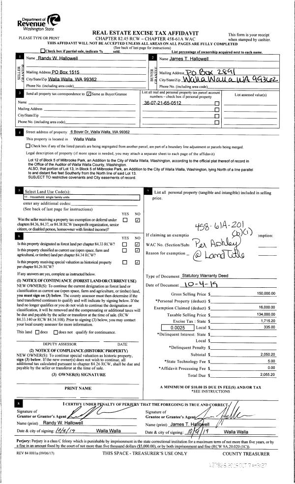 | 1 | 10/07/2019 | SWD | STATUTORY WARRANTY DEED | HALLOWELL RANDY W | HALLOWELL JAMES T | | | $134,000.00 | 137826 | 2019-07983 |