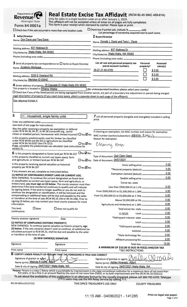 | 1 | 04/07/2021 | QCD | QUIT CLAIM DEED | DAVIS DON & TERA | DAVIS DONALD J & TERA L | | | $0.00 | 141285 | 2021-04093 |