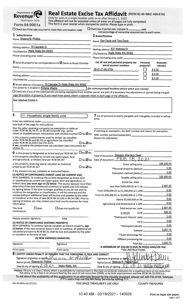 | 2 | 02/19/2021 | SWD | STATUTORY WARRANTY DEED | PHILLIPS SHAUNA M | DAVIS DON & TERA | | | $226,500.00 | 140929 | 2021-01932 |