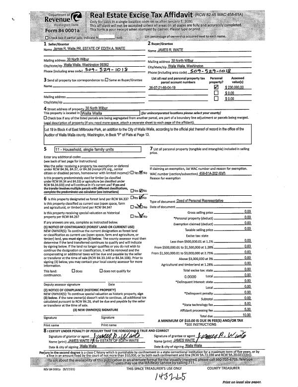 | 3 | | DPR | DEED OF PERSONAL REPRESENTATIVE | WAITE EDITH A ESTATE | | | | | 143265 | NO DEED |