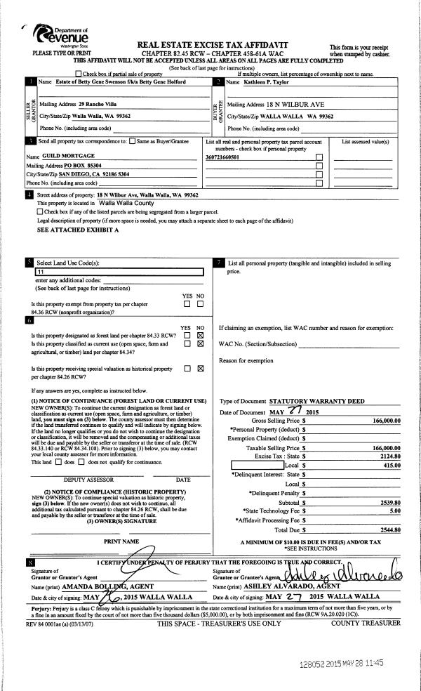| 4 | 05/28/2015 | SWD | STATUTORY WARRANTY DEED | HOLFORD BETTY GENE ESTATE OF | TAYLOR KATHLEEN P | | | $166,000.00 | 128052 | 2015-04498 |