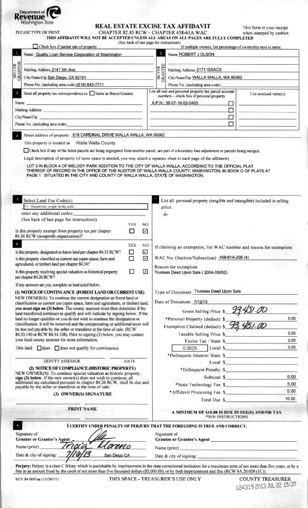 | 3 | 07/22/2013 | WARRANTY D | WARRANTY DEED | QUALITY LOAN SERVICE CORPORATI | OLSON, ROBERT J | | | $93,451.00 | 124319 | 2013-07401 |