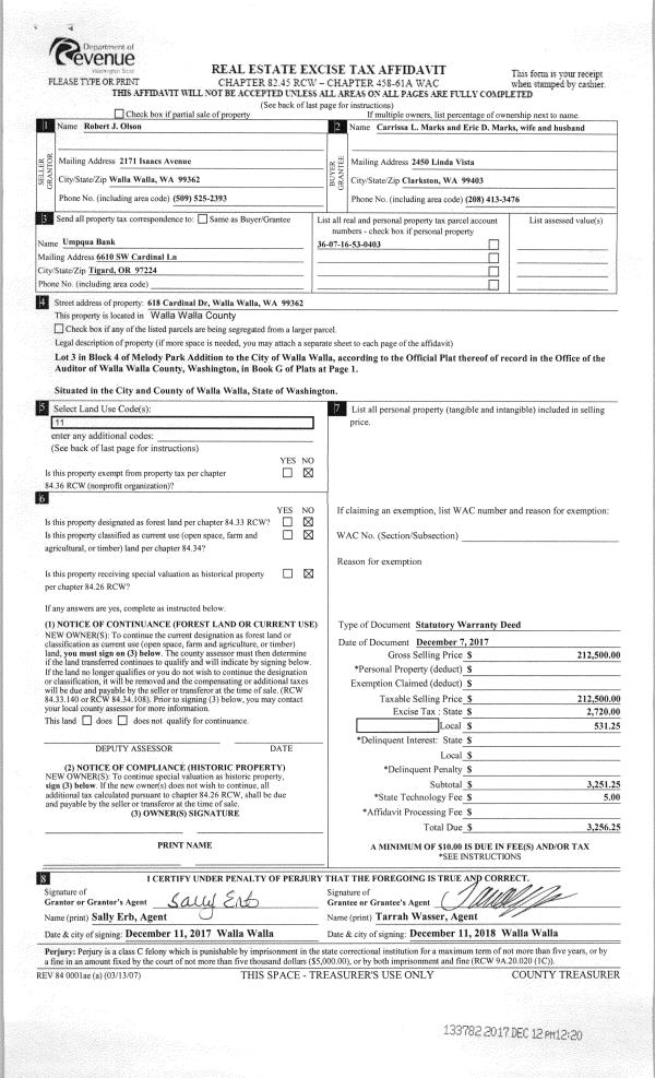 | 2 | 12/12/2017 | SWD | STATUTORY WARRANTY DEED | OLSON ROBERT J | MARKS ERIC D & CARRISSA L | | | $212,500.00 | 133782 | 2017-09990 |