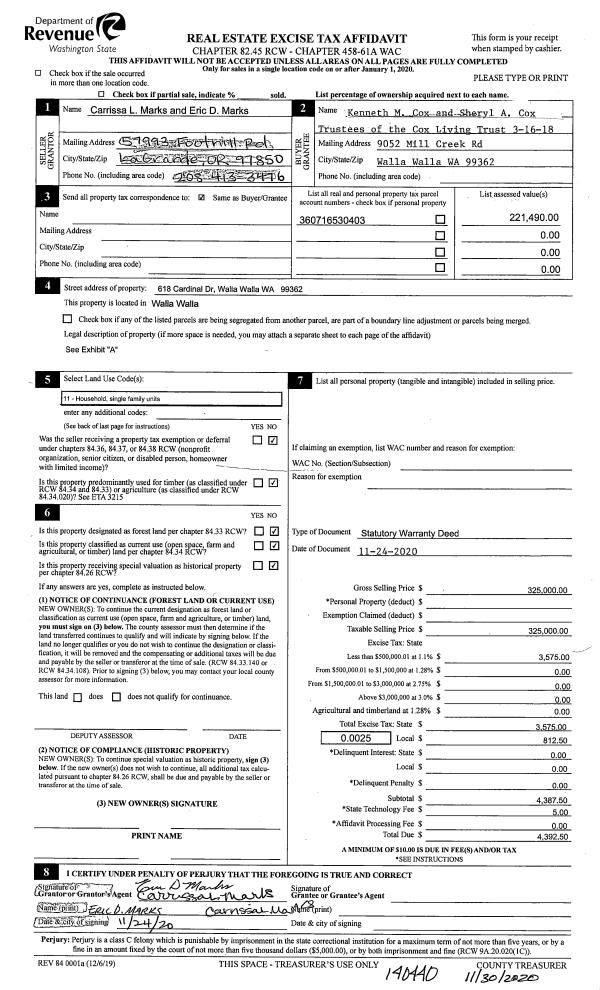 | 1 | 11/30/2020 | SWD | STATUTORY WARRANTY DEED | MARKS ERIC D & CARRISSA L | COX LIVING TRUST | | | $325,000.00 | 140440 | 2020-12597 |