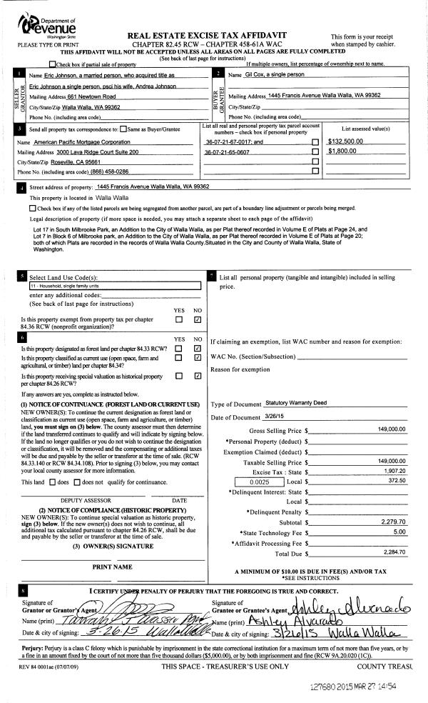 | 2 | 03/27/2015 | SWD | STATUTORY WARRANTY DEED | JOHNSON ERIC | COX GIL | | 2-PARCELS | $149,000.00 | 127680 | 2015-02537 |