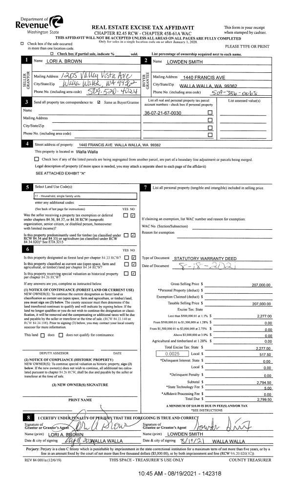 | 1 | 08/19/2021 | SWD | STATUTORY WARRANTY DEED | BROWN LORI A | SMITH LOWDEN | | | $207,000.00 | 142318 | 2021-10115 |