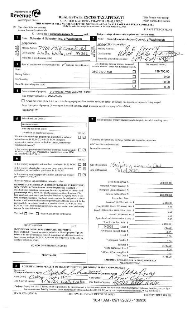 | 1 | 09/17/2020 | SWD | STATUTORY WARRANTY DEED | SCHUSTER & SCHUSTER INC | BLUE MOUNTAIN ACTION COUNCIL | | | $280,000.00 | 139930 | 2020-09510 |