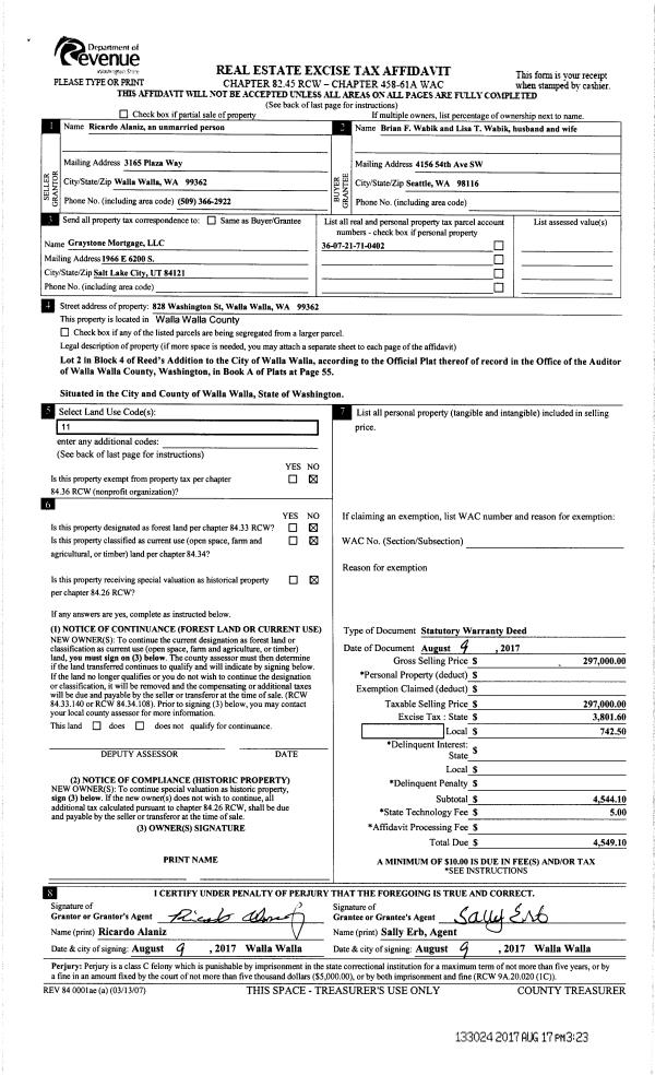 | 2 | 08/17/2017 | SWD | STATUTORY WARRANTY DEED | ALANIZ RICARDO | WABIK BRIAN F & LISA T | | | $297,000.00 | 133024 | 2017-06397 |