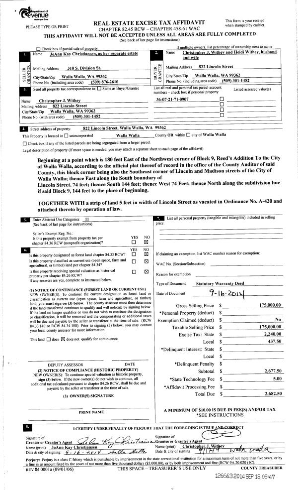 | 4 | 09/16/2014 | SWD | STATUTORY WARRANTY DEED | CHRISTIANSEN JO ANN KAY | WITHEY CHRISTOPHER J & HEIDI | | | $175,000.00 | 126663 | 2014-06831 |
