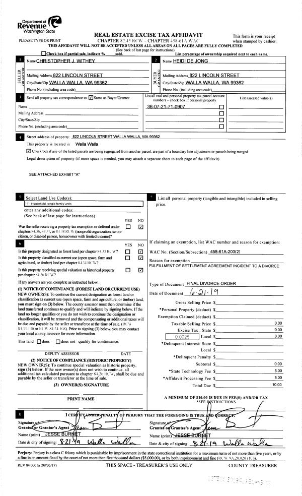 | 3 | 08/21/2019 | DECREE APP | DECREE OF APPROPRIAION | WITHEY CHRISTOPHER J & HEIDI | DE JONG HEIDI | | | $0.00 | 137534 | CC 15-3-00276-1 |