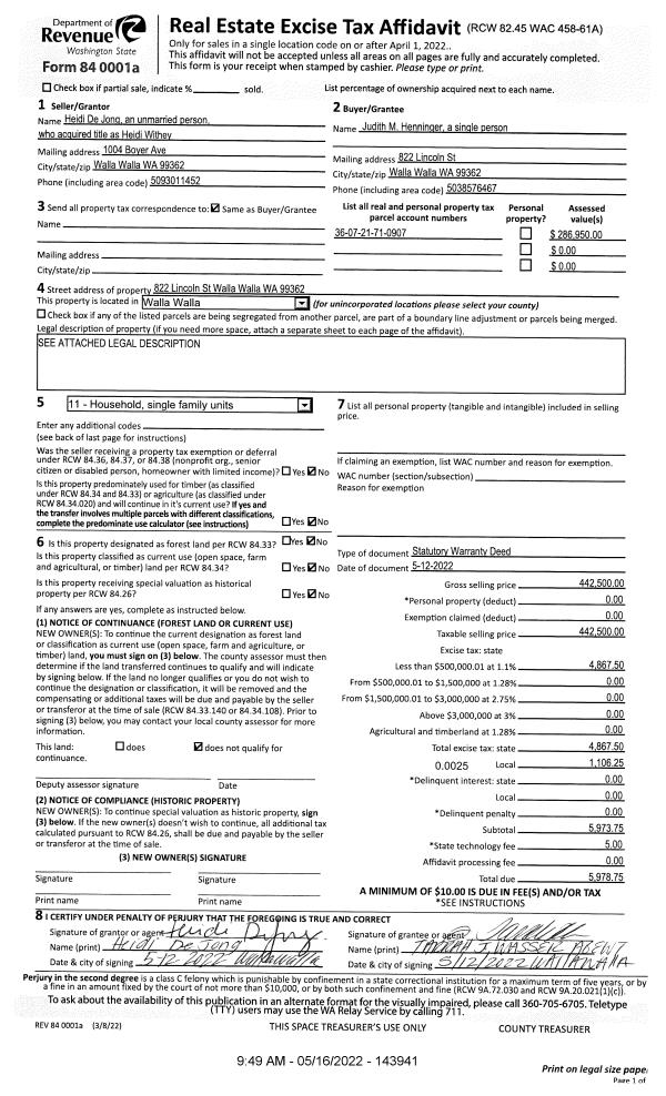 | 2 | 05/16/2022 | SWD | STATUTORY WARRANTY DEED | DE JONG HEIDI | HENNINGER JUDITH M | | | $442,500.00 | 143941 | 2022-04111 |