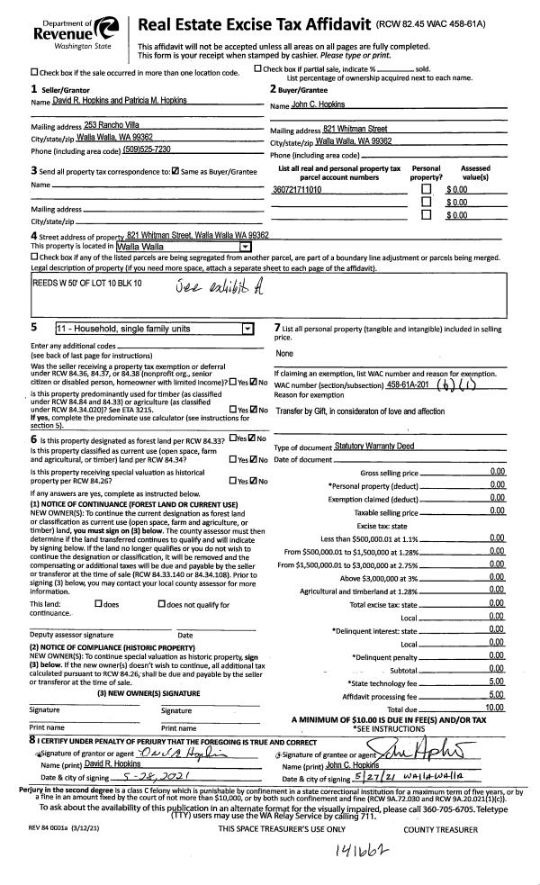 | 1 | 05/28/2021 | SWD | STATUTORY WARRANTY DEED | HOPKINS DAVID R | HOPKINS JOHN C | | | $0.00 | 141662 | 2021-06504 |