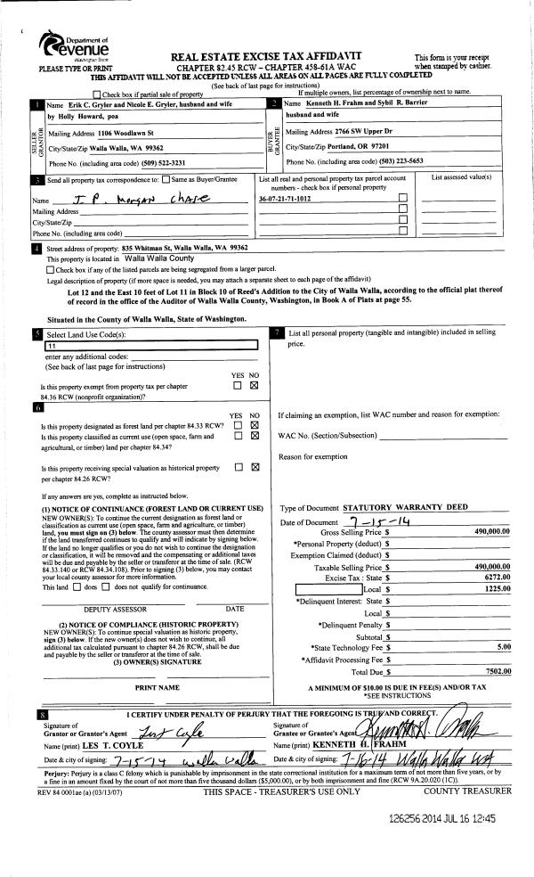 | 1 | 07/16/2014 | SWD | STATUTORY WARRANTY DEED | GRYLER ERIK C & NICOLE E | FRAHM KENNETH H | | | $490,000.00 | 126256 | 2014-04950 |