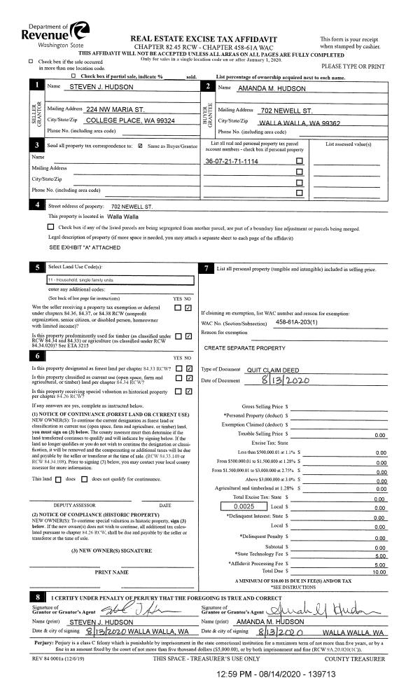 | 1 | 08/14/2020 | QCD | QUIT CLAIM DEED | HUDSON STEVEN J | HUDSON AMANDA M | | | | 67777 | 2020-08088 |