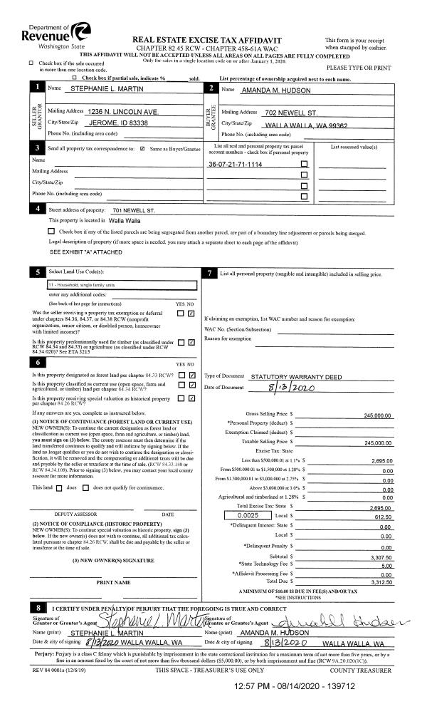 | 2 | 08/14/2020 | SWD | STATUTORY WARRANTY DEED | MARTIN STEPHANIE L | HUDSON AMANDA M | | | $245,000.00 | 139712 | 2020-08087 |