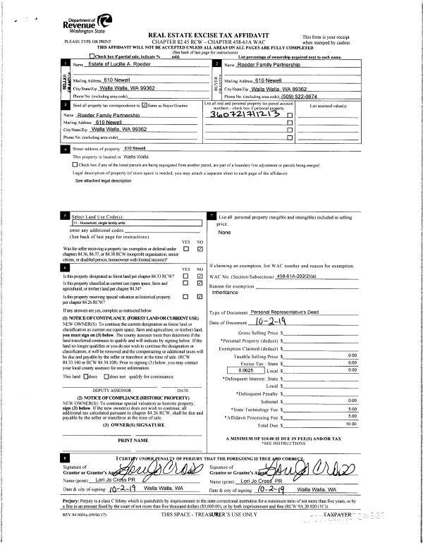 | 3 | 10/02/2019 | DPR | DEED OF PERSONAL REPRESENTATIVE | ROEDER LUCILLE ESTATE OF | ROEDER FAMILY PARTNERSHIP | | | $0.00 | 137803 | 2019-07838 |