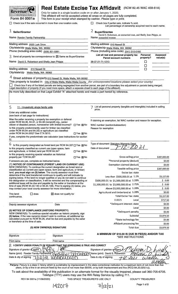 | 2 | 07/12/2021 | SWD | STATUTORY WARRANTY DEED | ROEDER FAMILY PARTNERSHIP | ROBERTSON DAVID S | | | $287,000.00 | 142017 | 2021-08429 |