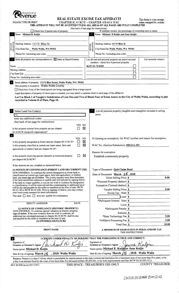 | 3 | 03/15/2018 | QCD | QUIT CLAIM DEED | KULJIS MICHAEL D | KULJIS MICHAEL D & JUNE | | | $0.00 | 134316 | 2018-02022 |