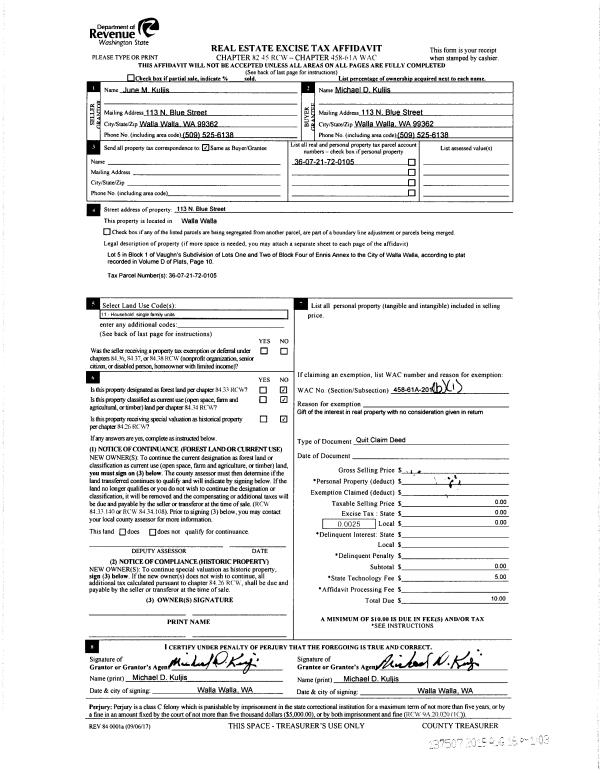 | 2 | 08/16/2019 | QCD | QUIT CLAIM DEED | KULJIS MICHAEL D & JUNE | KULJIS MICHAEL D | | | $0.00 | 137507 | 2019-06211 |