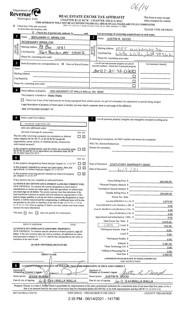 | 2 | 06/14/2021 | SWD | STATUTORY WARRANTY DEED | BRIMLOW BENJAMIN O & ROSEMARY | GOOD JUSTIN R | | | $325,000.00 | 141796 | 2021-07236 |