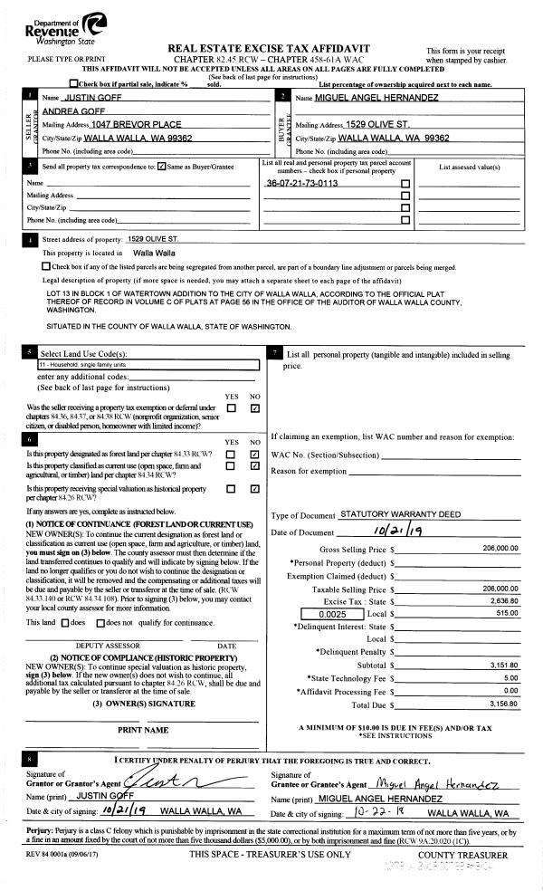 | 1 | 10/22/2019 | SWD | STATUTORY WARRANTY DEED | GOFF JUSTIN | HERNANDEZ MIGUEL ANGEL | | | $206,000.00 | 137914 | 2019-08469 |