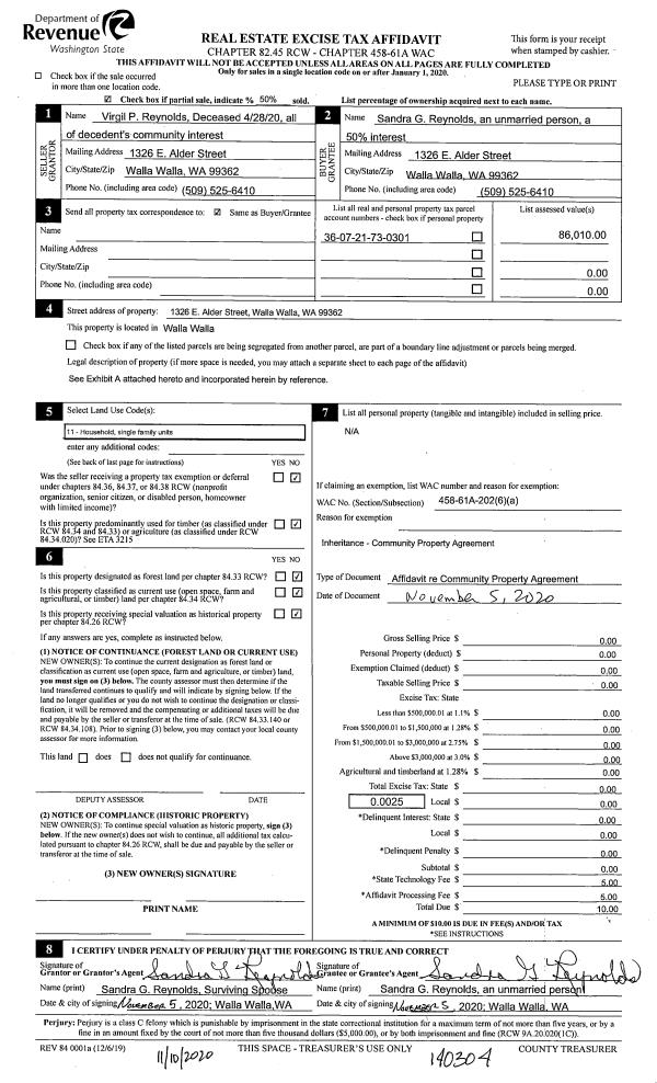 | 1 | 11/10/2020 | AFFIDAVIT | AFFIDAVIT | REYNOLDS VIRGIL P | REYNOLDS SANDRA G | | | | 140304 | 2020-11859 |