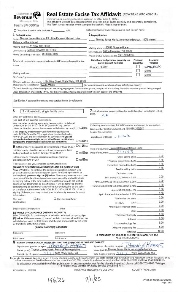 | 1 | 07/11/2023 | DPR | DEED OF PERSONAL REPRESENTATIVE | BABCOCK MARIAN L ESTATE OF | HARRIS THOMAS JAMES | | | $0.00 | 146126 | 2023-03907 |