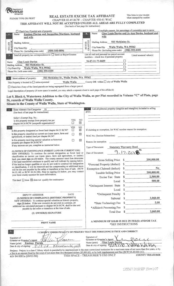 | 1 | 09/19/2018 | SWD | STATUTORY WARRANTY DEED | FLORIAN ESTEBAN | DAVIES GLEN LOUIS & JO ANN | | | $200,000.00 | 135567 | 2018-07797 |