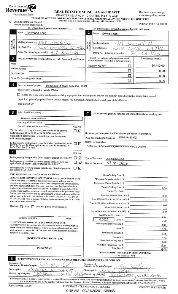| 2 | 09/07/2010 | WARRANTY D | WARRANTY DEED | WALLA WALLA COUNTY TREASURER | TANG, RAYMOND K & SYLVIA | | | $50,000.00 | 118978 | 2010-07041 |