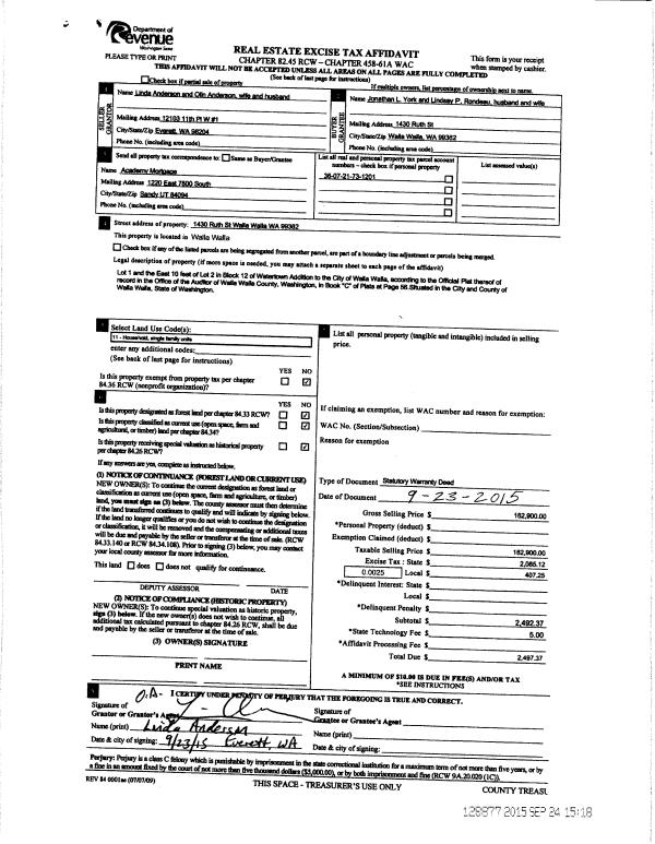 | 2 | 09/24/2015 | SWD | STATUTORY WARRANTY DEED | ANDERSON OLIN & LINDA | YORK JONATHAN L | | | $162,900.00 | 128877 | 2015-08393 |