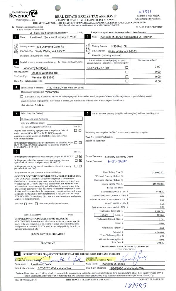 | 1 | 08/28/2020 | SWD | STATUTORY WARRANTY DEED | YORK JONATHAN L | JONES KENNETH M | | | $318,000.00 | 139795 | 2020-08669 |