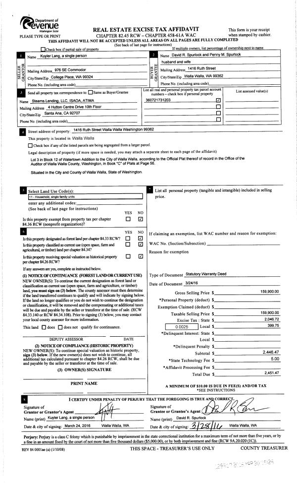 | 3 | 03/30/2016 | SWD | STATUTORY WARRANTY DEED | LANG KUYLER | SPURLOCK DAVID R & PENNY M | | | $159,900.00 | 129917 | 2016-02329 |