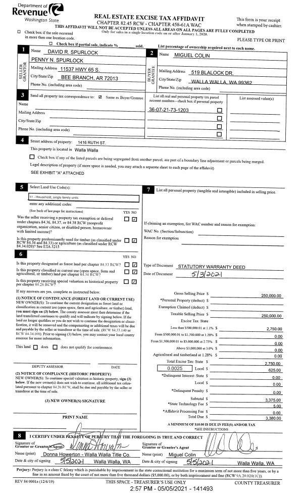 | 2 | 05/05/2021 | SWD | STATUTORY WARRANTY DEED | SPURLOCK DAVID R & PENNY M | COLIN MIGUEL | | | $250,000.00 | 141493 | 2021-05360 |