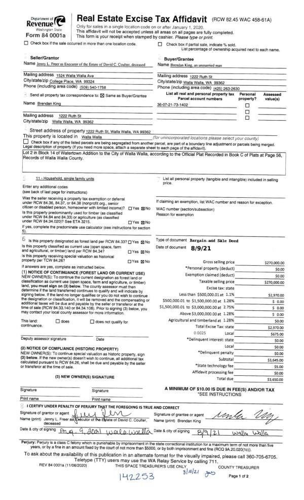 | 1 | 08/10/2021 | BARGAIN & | BARGAIN & SALE DEED | COULTER DAVID C ESTATE OF | KING BRENDAN | | | $270,000.00 | 142253 | 2021-09745 |