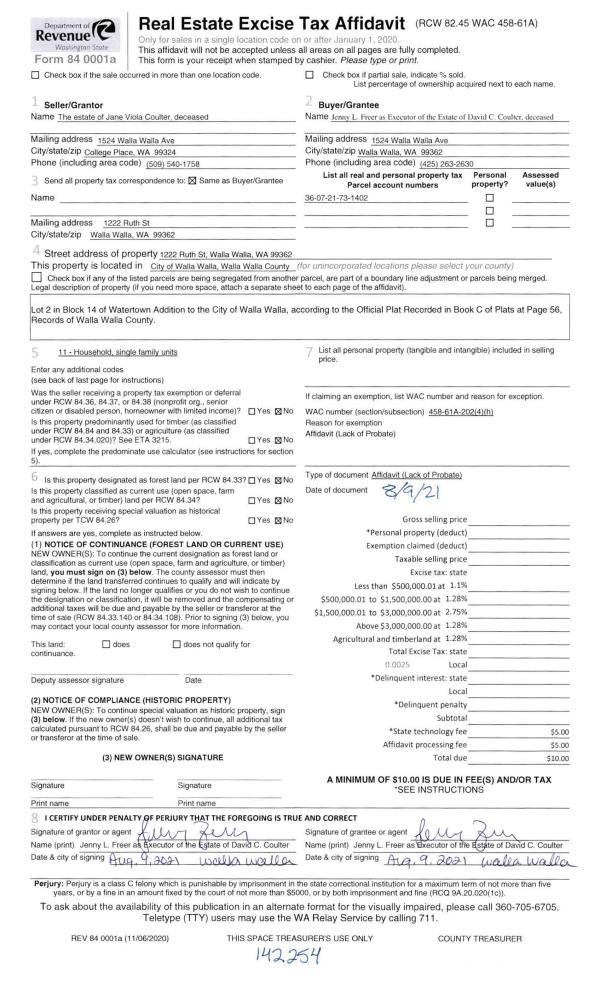 | 2 | 08/10/2021 | LOPA | LACK OF PROBATE AFFIDAVIT | COULTER DAVID C & JANE V | COULTER DAVID C ESTATE OF | | | $0.00 | 142254 | 2021-09744 |