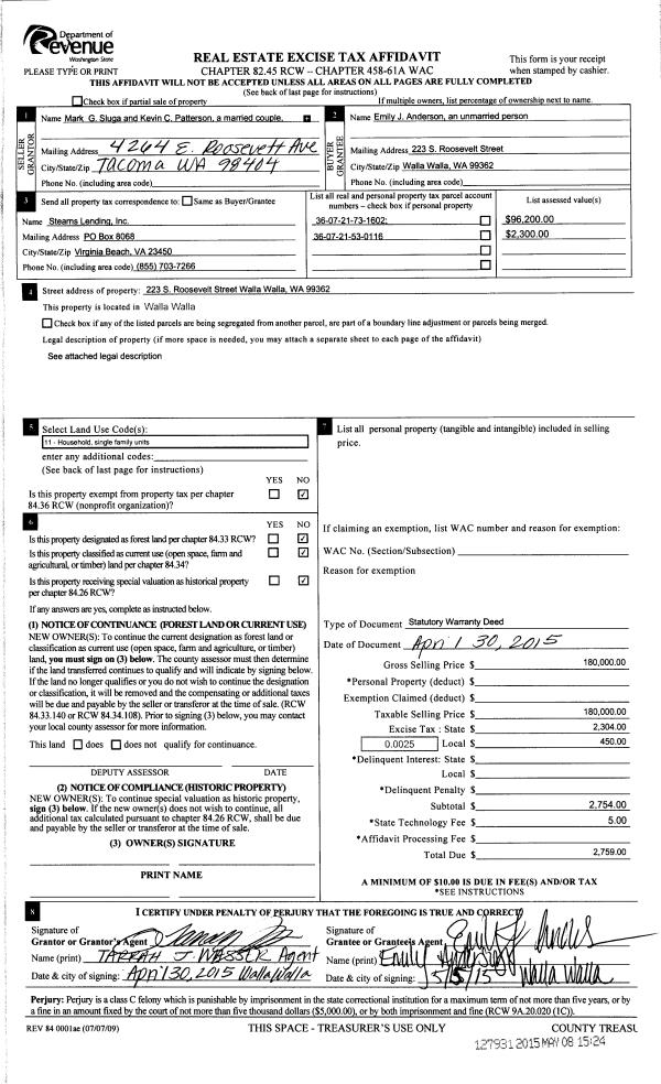 | 1 | 05/08/2015 | SWD | STATUTORY WARRANTY DEED | SLUGA MARK G | ANDERSON EMILY J | | 2-PARCELS | $180,000.00 | 127931 | 2015-03906 |