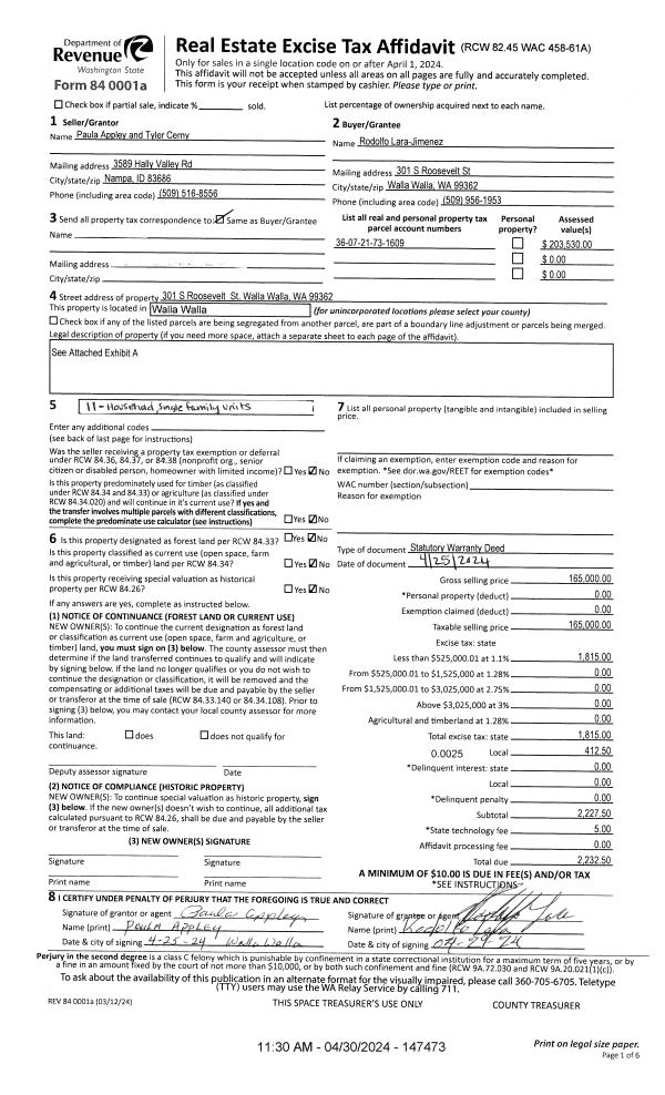 | 1 | 04/30/2024 | SWD | STATUTORY WARRANTY DEED | APPLEY PAULA | LARA-JIMENEZ RODOLFO | | | $165,000.00 | 147473 | 2024-02206 |